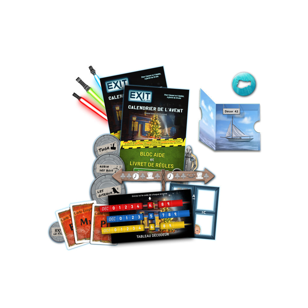 EXIT est un jeu qui reprend les sensations des escape games. Muni d'indices, de matériel et d'un décodeur, vous aurez pour mission de sortir du jeu le plus rapidement possible. Votre plateau est le calendrier de l’avent lui-même. Il est complété par le bloc Histoire. Vous y apprendrez exactement ce qui arrive à votre personnage, et trouverez chaque jour un nouveau chapitre.